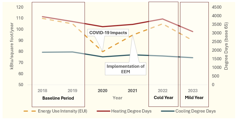 In this example, the building’s baseline period is comprised of the relatively cold calendar years 2018 and 2019 causing higher energy consumption due to increased heating loads.6 During the COVID-19 Public Health Emergency (PHE) there is a serious decline in energy consumption due to stay-at-home work schedules in 2020. Resourcefully, the building owner uses the lack of tenants in the building to implement an EEM, so that in 2021 the building has begun to show some energy savings. However, in 2022 there is a relatively cold winter requiring higher heating loads than usual resulting in a spike in energy consumption for that year. Thankfully, in 2023 the weather is relatively mild, and the building shows improved energy performance from the baseline, because of the EEM.